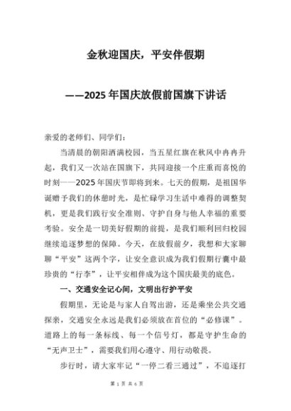 【七哥公文】2025年:2025年国庆放假前国旗下讲话:金秋迎国庆,平安伴假期+更多免费公文+VX:QiGeGongWen2024