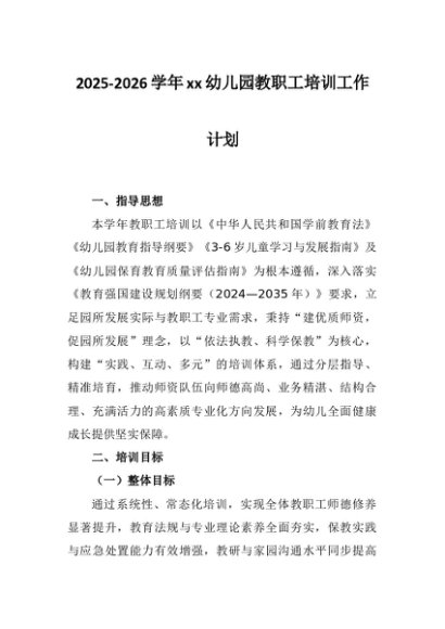 【七哥公文】2025年:2025-2026学年xx幼儿园教职工培训工作计划+更多免费公文+VX:QiGeGongWen2024