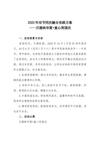 【七哥公文】2025年:2025年双节同庆融合实践方案——月圆映华夏•童心贺国庆+更多免费公文+VX:QiGeGongWen2024