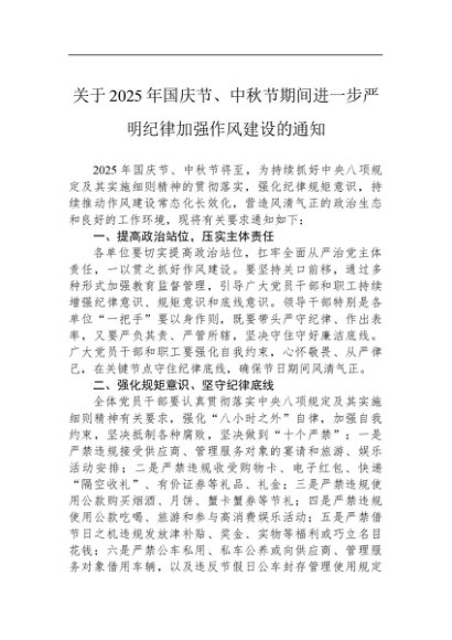 【七哥公文】2025年:【七哥公文】关于2025年国庆节、中秋节期间进一步严明纪律加强作风建设的通知+更多免费公文+VX:QiGeGongWen2024