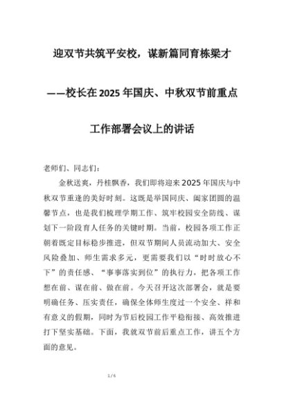 【七哥公文】2025年:校长在2025年国庆、中秋双节前重点工作部署会议上的讲话:迎双节共筑平安校,谋新篇同育栋梁才+更多免费公文+VX:QiGeGongWen2024