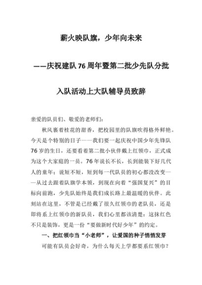 【七哥公文】2025年:庆祝建队76周年暨第二批少先队分批入队活动上大队辅导员致辞:薪火映队旗,少年向未来+更多免费公文+VX:QiGeGongWen2024