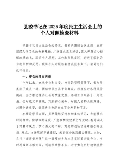 【七哥公文】2025年:县委书记在2025年度民主生活会上的个人对照检查材料+更多免费公文+VX:QiGeGongWen2024