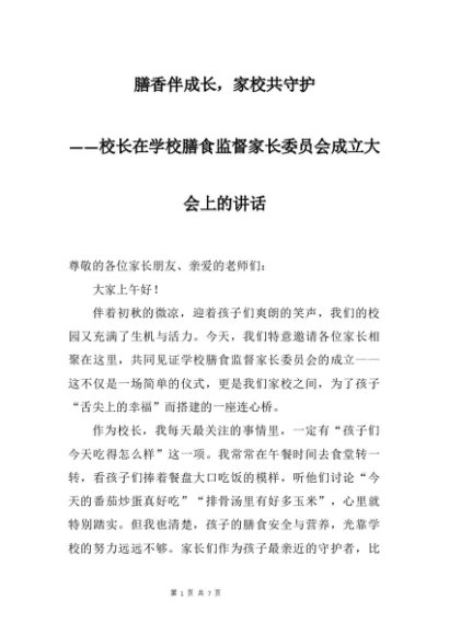 【七哥公文】2025年:校长在学校膳食监督家长委员会成立大会上的讲话:膳香伴成长,家校共守护+更多免费公文+VX:QiGeGongWen2024