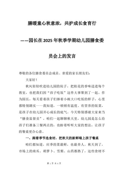 【七哥公文】2025年:园长在2025年秋季学期幼儿园膳食委员会上的发言:膳暖童心秋意浓,共护成长食育行+更多免费公文+VX:QiGeGongWen2024