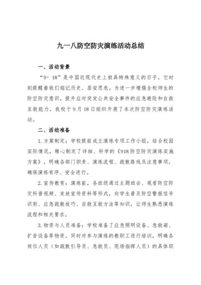 【七哥公文】2025年:九一八防空防灾演练活动总结+更多免费公文+VX:QiGeGongWen2024