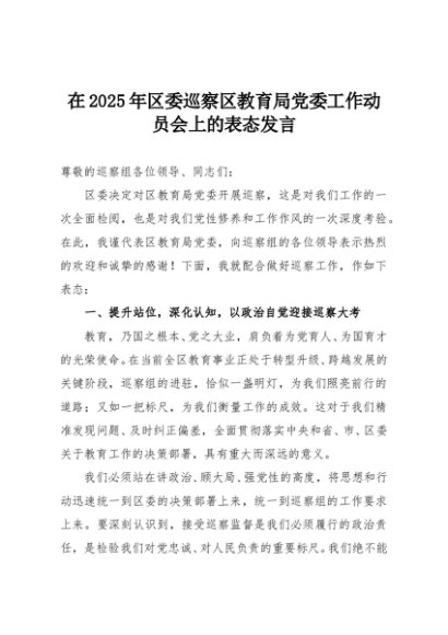 【七哥公文】2025年:在2025年区委巡察区教育局党委工作动员会上的表态发言+更多免费公文+VX:QiGeGongWen2024