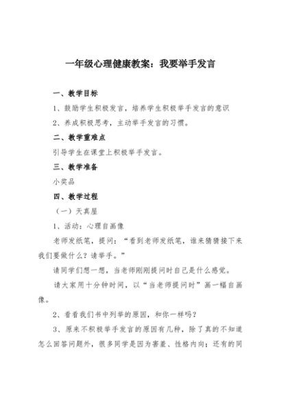 【七哥公文】2025年:一年级心理健康教案:我要举手发言+更多免费公文+VX:QiGeGongWen2024
