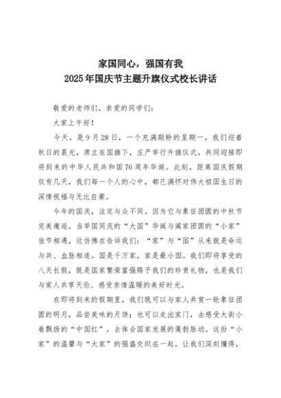 【七哥公文】2025年:家国同心,强国有我-2025年国庆节主题升旗仪式校长讲话+更多免费公文+VX:QiGeGongWen2024