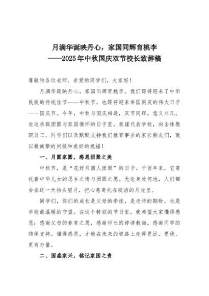 【七哥公文】2025年:月满华诞映丹心,家国同辉育桃李——2025年中秋国庆双节校长致辞稿+更多免费公文+VX:QiGeGongWen2024