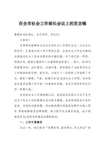 / 【七哥公文】2025年:在全市社会工作部长会议上的发言稿+更多免费公文+VX:QiGeGongWen2024