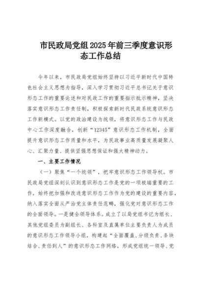 / 【七哥公文】2025年:市民政局党组2025年前三季度意识形态工作总结+更多免费公文+VX:QiGeGongWen2024