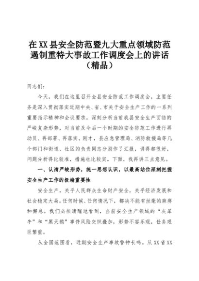 【七哥公文】2025年:在XX县安全防范暨九大重点领域防范遏制重特大事故工作调度会上的讲话(精品)+更多免费公文+VX:QiGeGongWen2024