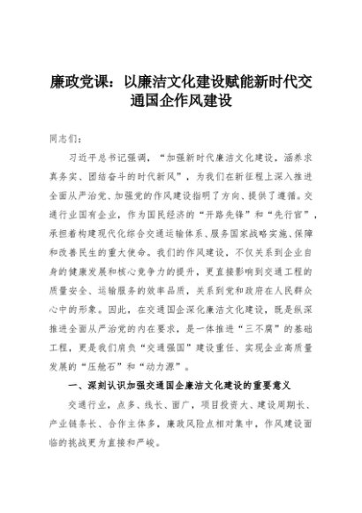 【七哥公文】2025年:廉政党课:以廉洁文化建设赋能新时代交通国企作风建设+更多免费公文+VX:QiGeGongWen2024