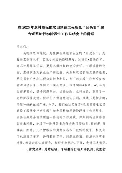 【七哥公文】2025年:在2025年农村高标准农田建设工程质量“回头看”和专项整治行动阶段性工作总结会上的讲话+更多免费公文+VX:QiGeGongWen2024