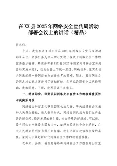 【七哥公文】2025年:在XX县2025年网络安全宣传周活动部署会议上的讲话(精品)+更多免费公文+VX:QiGeGongWen2024