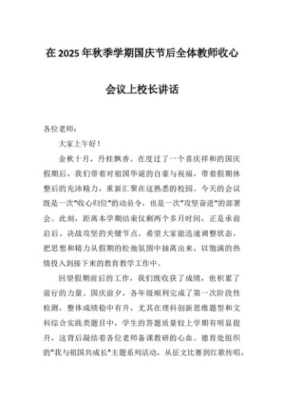 【七哥公文】2025年:在2025年秋季学期国庆节后全体教师收心会议上校长讲话+更多免费公文+VX:QiGeGongWen2024