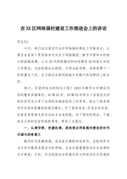 / 【七哥公文】2025年:在XX区网络强村建设工作推进会上的讲话+更多免费公文+VX:QiGeGongWen2024