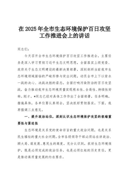 【七哥公文】2025年:在2025年全市生态环境保护百日攻坚工作推进会上的讲话+更多免费公文+VX:QiGeGongWen2024