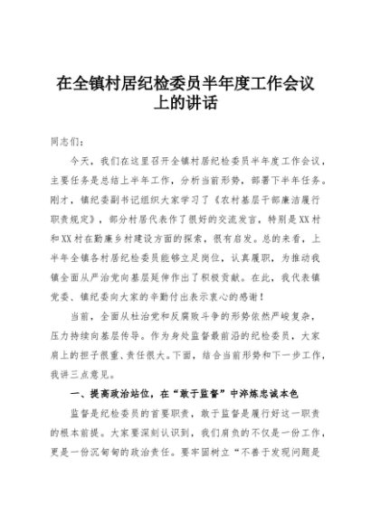 / 【七哥公文】2025年:在全镇村居纪检委员半年度工作会议上的讲话+更多免费公文+VX:QiGeGongWen2024