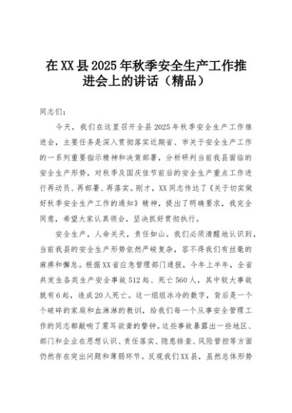 【七哥公文】2025年:在XX县2025年秋季安全生产工作推进会上的讲话(精品)+更多免费公文+VX:QiGeGongWen2024