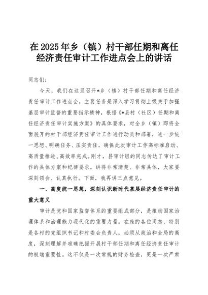 【七哥公文】2025年:在2025年乡(镇)村干部任期和离任经济责任审计工作进点会上的讲话+更多免费公文+VX:QiGeGongWen2024