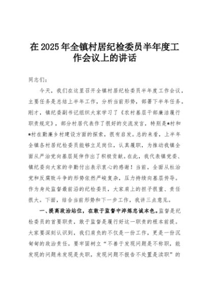 【七哥公文】2025年:在2025年全镇村居纪检委员半年度工作会议上的讲话+更多免费公文+VX:QiGeGongWen2024