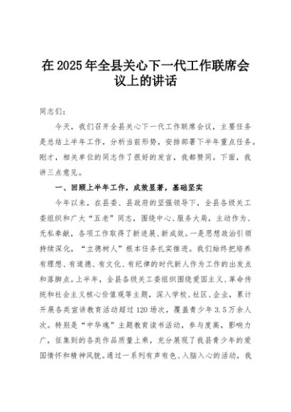 / 【七哥公文】2025年:在2025年全县关心下一代工作联席会议上的讲话+更多免费公文+VX:QiGeGongWen2024