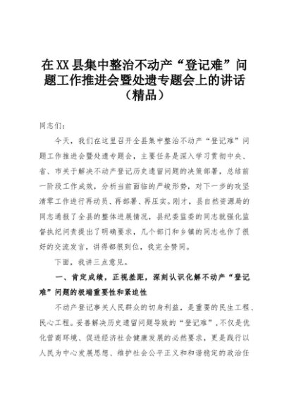 【七哥公文】2025年:在XX县集中整治不动产“登记难”问题工作推进会暨处遗专题会上的讲话(精品)+更多免费公文+VX:QiGeGongWen2024