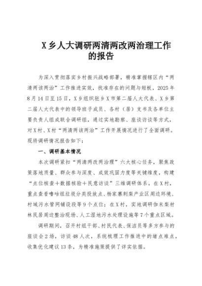 / 【七哥公文】2025年:X乡人大调研两清两改两治理工作的报告+更多免费公文+VX:QiGeGongWen2024