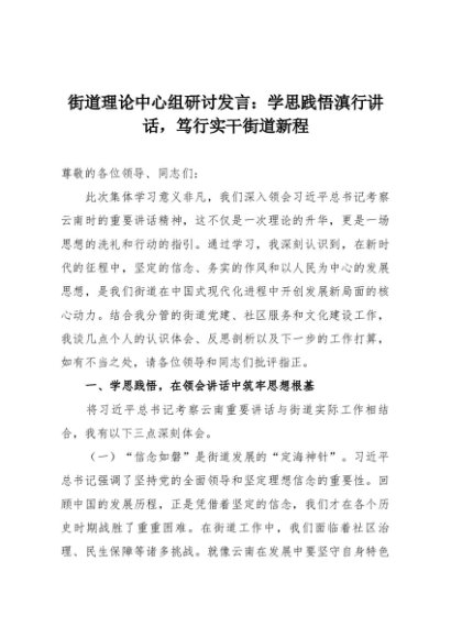 【七哥公文】2025年:街道理论中心组研讨发言:学思践悟滇行讲话,笃行实干街道新程+更多免费公文+VX:QiGeGongWen2024