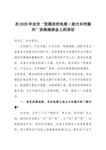 【七哥公文】2025年:在2025年全市‘发展农村电商·助力乡村振兴’协商座谈会上的讲话+更多免费公文+VX:QiGeGongWen2024