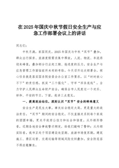 【七哥公文】2025年:在2025年国庆中秋节假日安全生产与应急工作部署会议上的讲话+更多免费公文+VX:QiGeGongWen2024