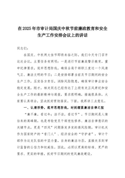 【七哥公文】2025年:在2025年市审计局国庆中秋节前廉政教育和安全生产工作安排会议上的讲话+更多免费公文+VX:QiGeGongWen2024