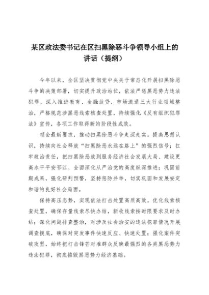 【七哥公文】2025年:某区政法委书记在区扫黑除恶斗争领导小组上的讲话(提纲)+更多免费公文+VX:QiGeGongWen2024