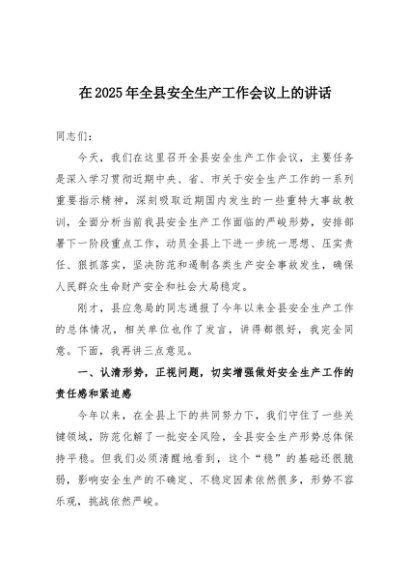 / 【七哥公文】2025年:在2025年全县安全生产工作会议上的讲话+更多免费公文+VX:QiGeGongWen2024