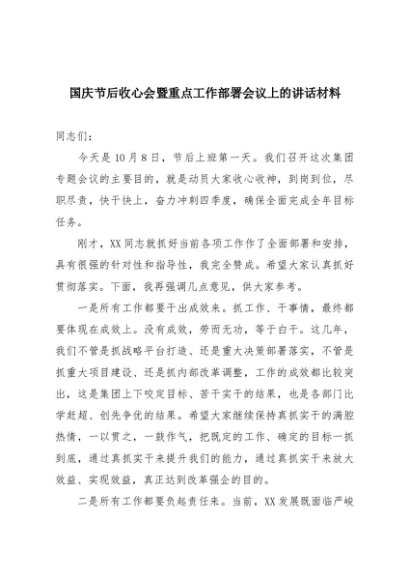 / 【七哥公文】2025年:国庆节后收心会暨重点工作部署会议上的讲话材料+更多免费公文+VX:QiGeGongWen2024