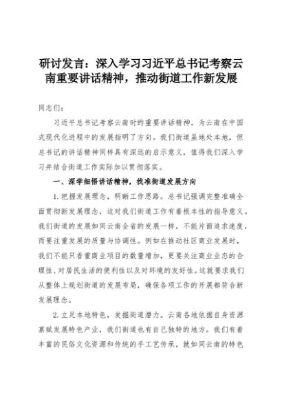 【七哥公文】2025年:研讨发言:深入学习习近平总书记考察云南重要讲话精神,推动街道工作新发展+更多免费公文+VX:QiGeGongWen2024