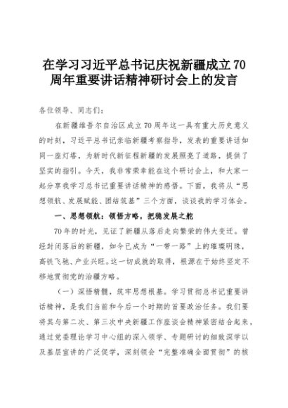 【七哥公文】2025年:在学习习近平总书记庆祝新疆成立70周年重要讲话精神研讨会上的发言+更多免费公文+VX:QiGeGongWen2024
