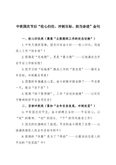 【七哥公文】2025年:中秋国庆节后“收心归位、冲刺目标、担当奋进”金句+更多免费公文+VX:QiGeGongWen2024