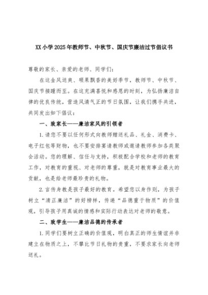 【七哥公文】2025年:XX小学2025年教师节、中秋节、国庆节廉洁过节倡议书+更多免费公文+VX:QiGeGongWen2024
