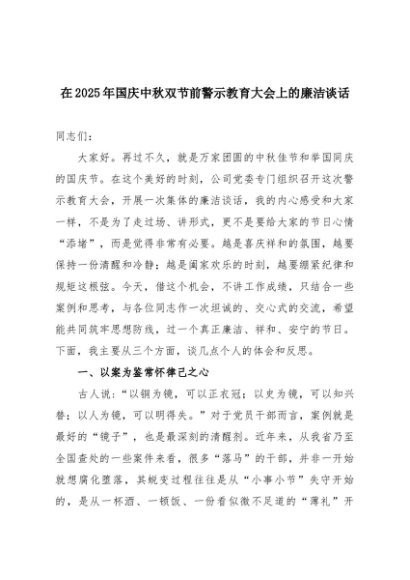 【七哥公文】2025年:在2025年国庆中秋双节前警示教育大会上的廉洁谈话+更多免费公文+VX:QiGeGongWen2024