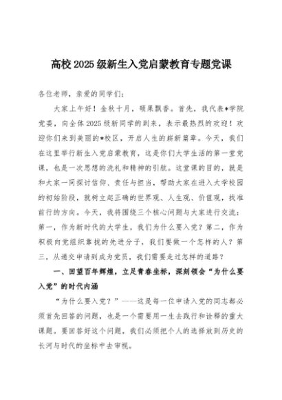 / 【七哥公文】2025年:高校2025级新生入党启蒙教育专题党课+更多免费公文+VX:QiGeGongWen2024