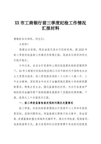 / 【七哥公文】2025年:XX市工商银行前三季度纪检工作情况汇报材料+更多免费公文+VX:QiGeGongWen2024