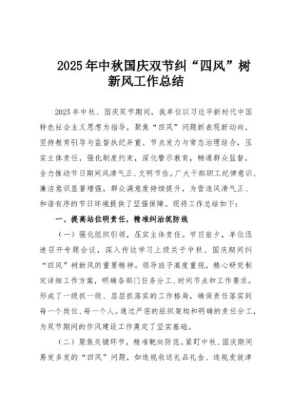 【七哥公文】2025年:2025年中秋国庆双节纠“四风”树新风工作总结+更多免费公文+VX:QiGeGongWen2024