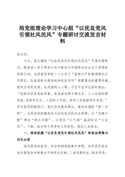 【七哥公文】2025年:局党组理论学习中心组“以优良党风引领社风民风”专题研讨交流发言材料+更多免费公文+VX:QiGeGongWen2024