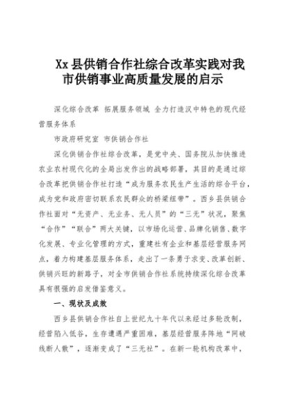 【七哥公文】2025年:Xx县供销合作社综合改革实践对我市供销事业高质量发展的启示+更多免费公文+VX:QiGeGongWen2024
