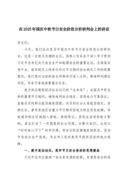 【七哥公文】2025年:在2025年国庆中秋节日安全防范分析研判会上的讲话+更多免费公文+VX:QiGeGongWen2024