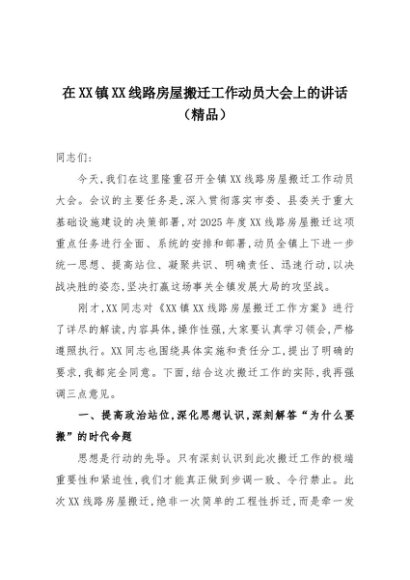 【七哥公文】2025年:在XX镇XX线路房屋搬迁工作动员大会上的讲话(精品)+更多免费公文+VX:QiGeGongWen2024