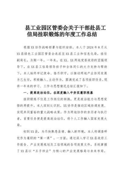 【七哥公文】2025年:县工业园区管委会关于干部赴县工信局挂职锻炼的年度工作总结+更多免费公文+VX:QiGeGongWen2024
